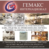 | Кратко инфо | ТРГОВИЈА СО: ОПРЕМА ЗА УГОСТИТЕЛСТВО, КАФЕ, СРЕДСТВА ЗА ПРОФЕСИОНАЛНА ХИГИЕНА И СЕРВИС ЗА ОПРЕМА ЗА УГОСТИТЕЛСТВО |